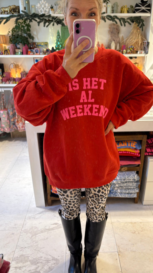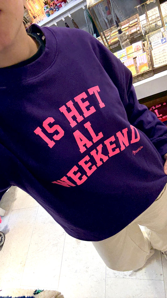 Trui: “Is het al weekend” Bordeaux met neon Roze