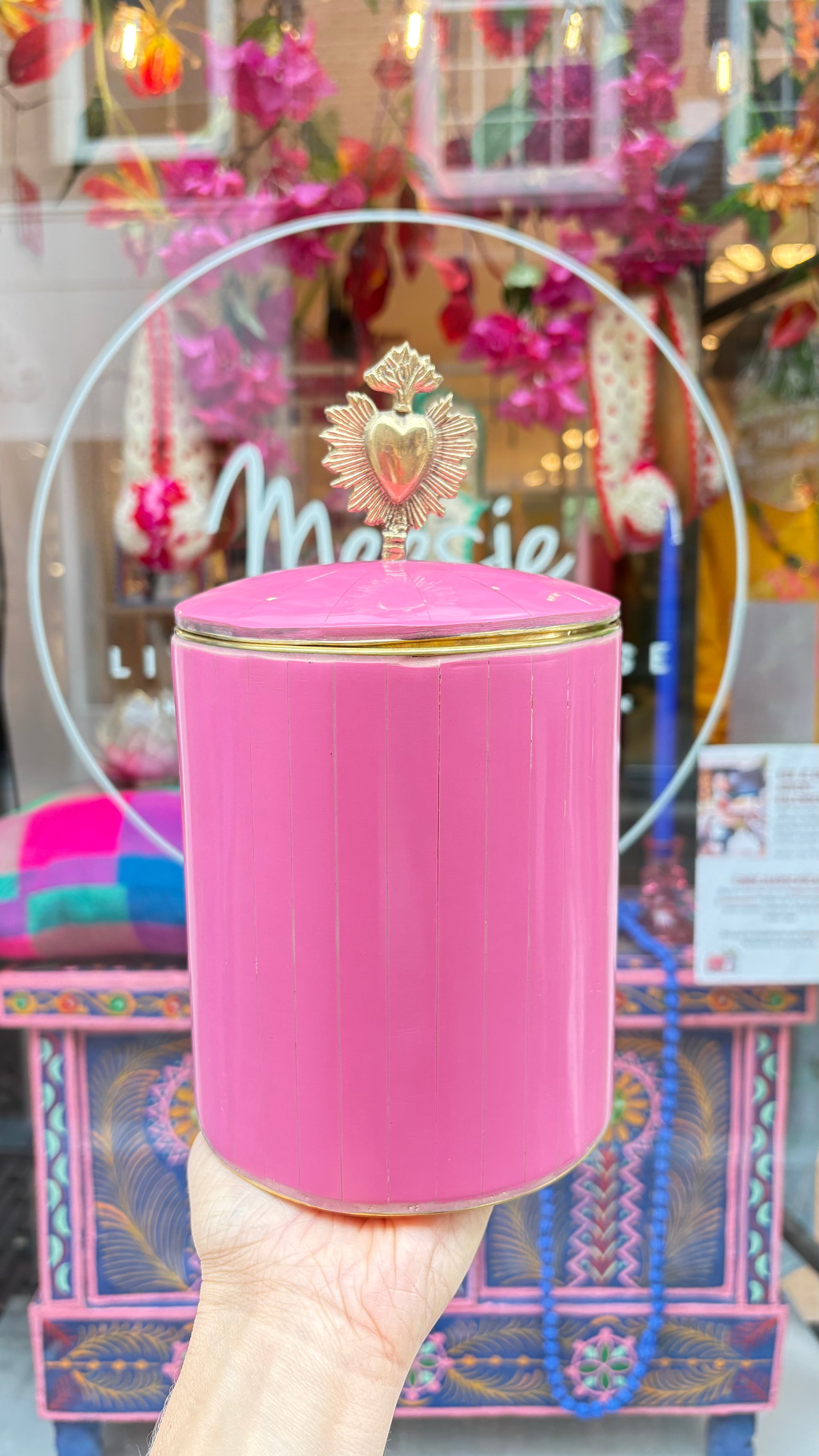 Afmeting van het roze doosje met een heilig hart knop is ongeveer: ø 13cm x 22cm Hoog