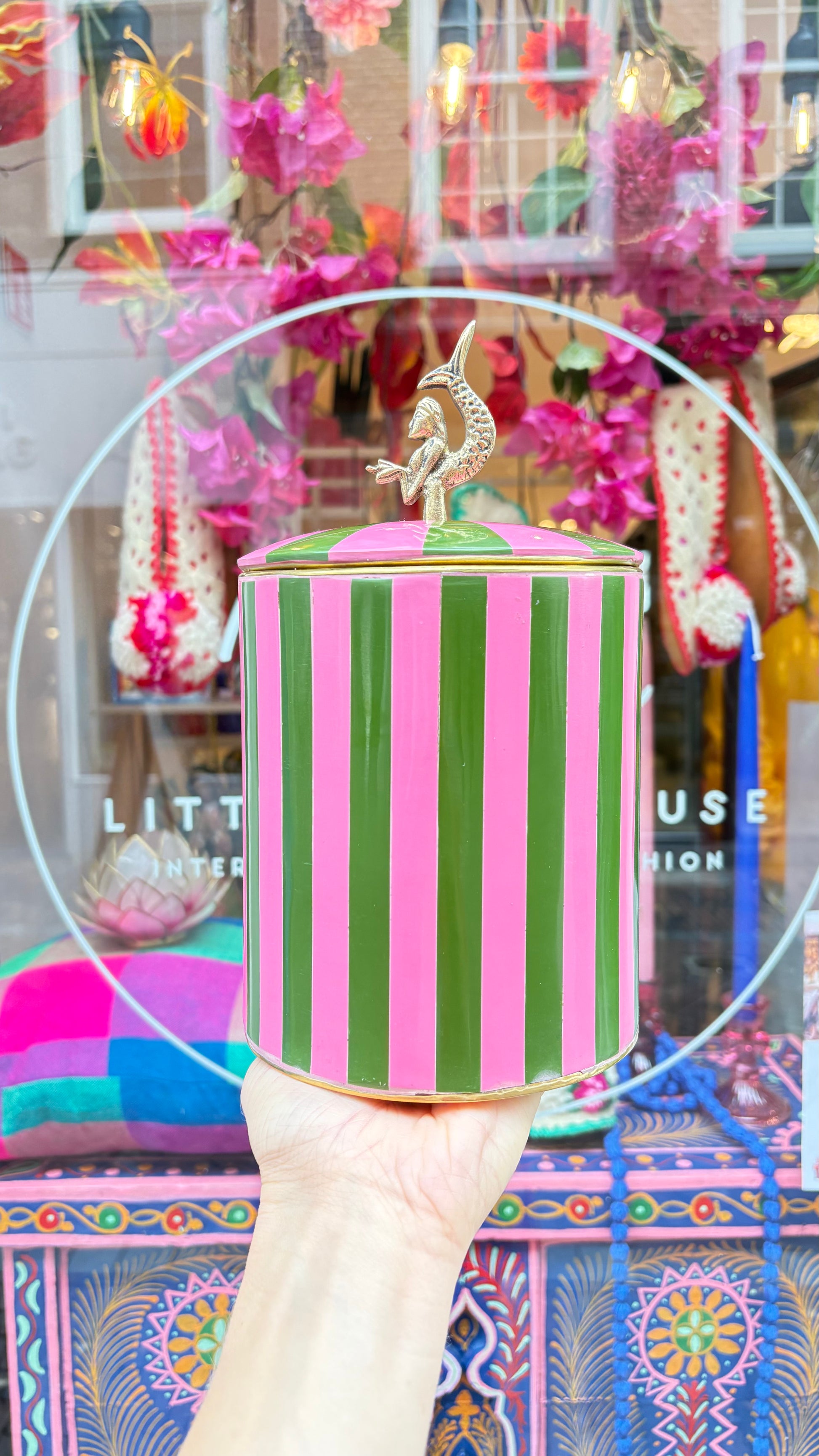 Afmeting van het roze met groen gestreept doosje met een zeemeermin knop is ongeveer: ø 13cm x 24cm Hoog