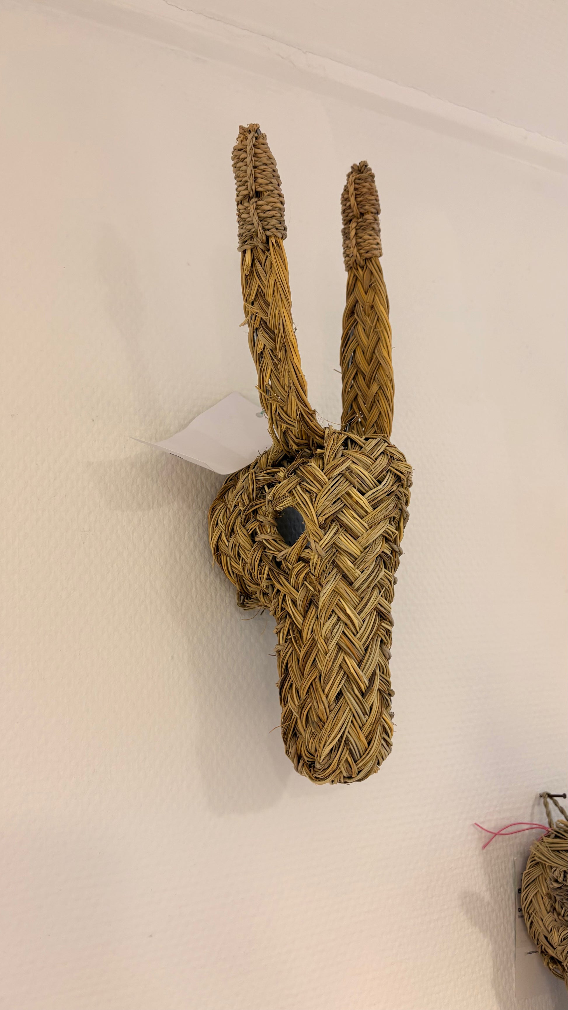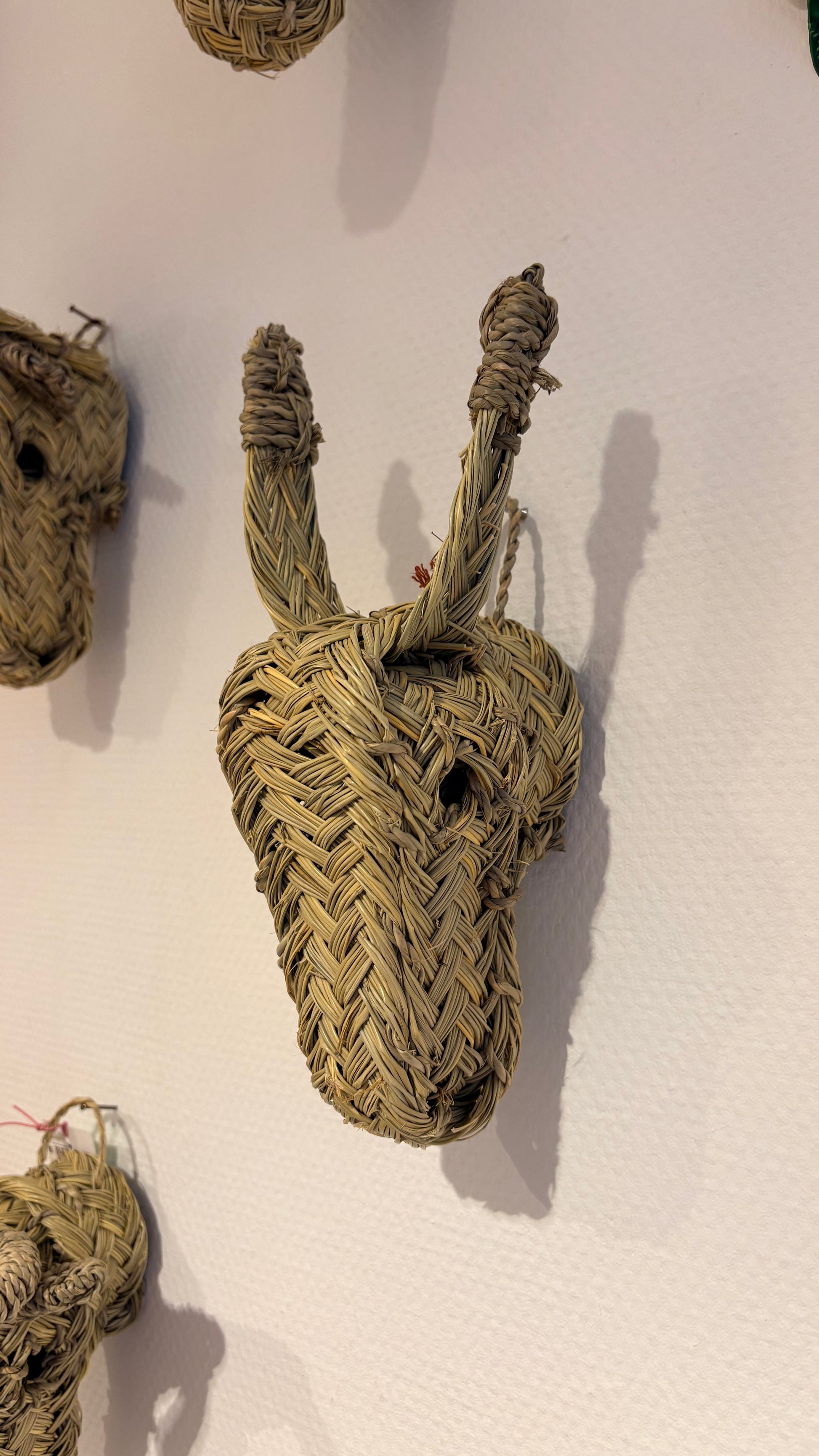 Deze prachtige dierenkopjes worden met de hand gevlochten van jong groen gras. Wanneer het kopje de juiste “shape” heeft, worden de diertjes gedroogd in de zon, waardoor ze hun gele naturel kleur krijgen. Wij hebben een ezel, geitje (met sik) steenbok en een kameel.