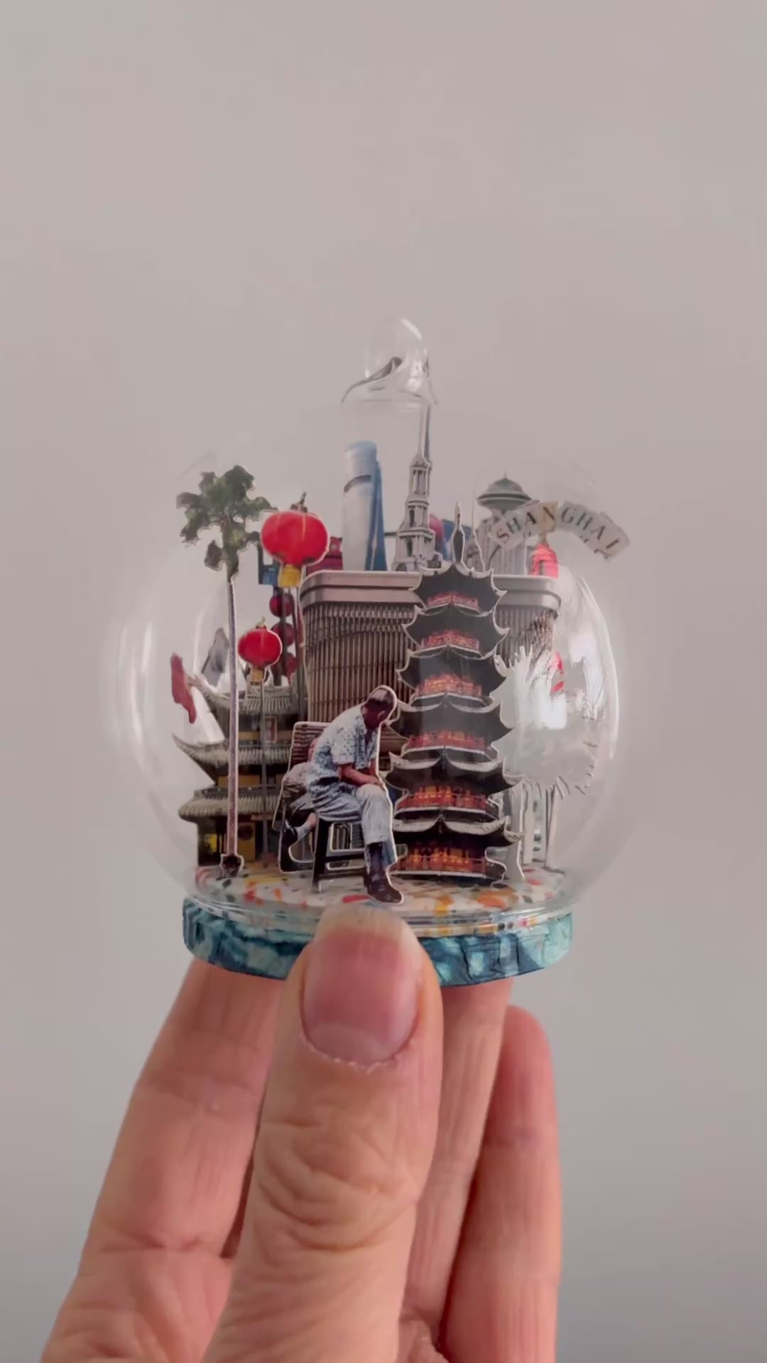 De mini ronde glazen stolpjes hebben een diorama miniatuur wereld van 360 graden. Deze van Shanghai is echt te gek voor alle mensen die heerlijke herinneringen hebben voor deze chaotische stad.