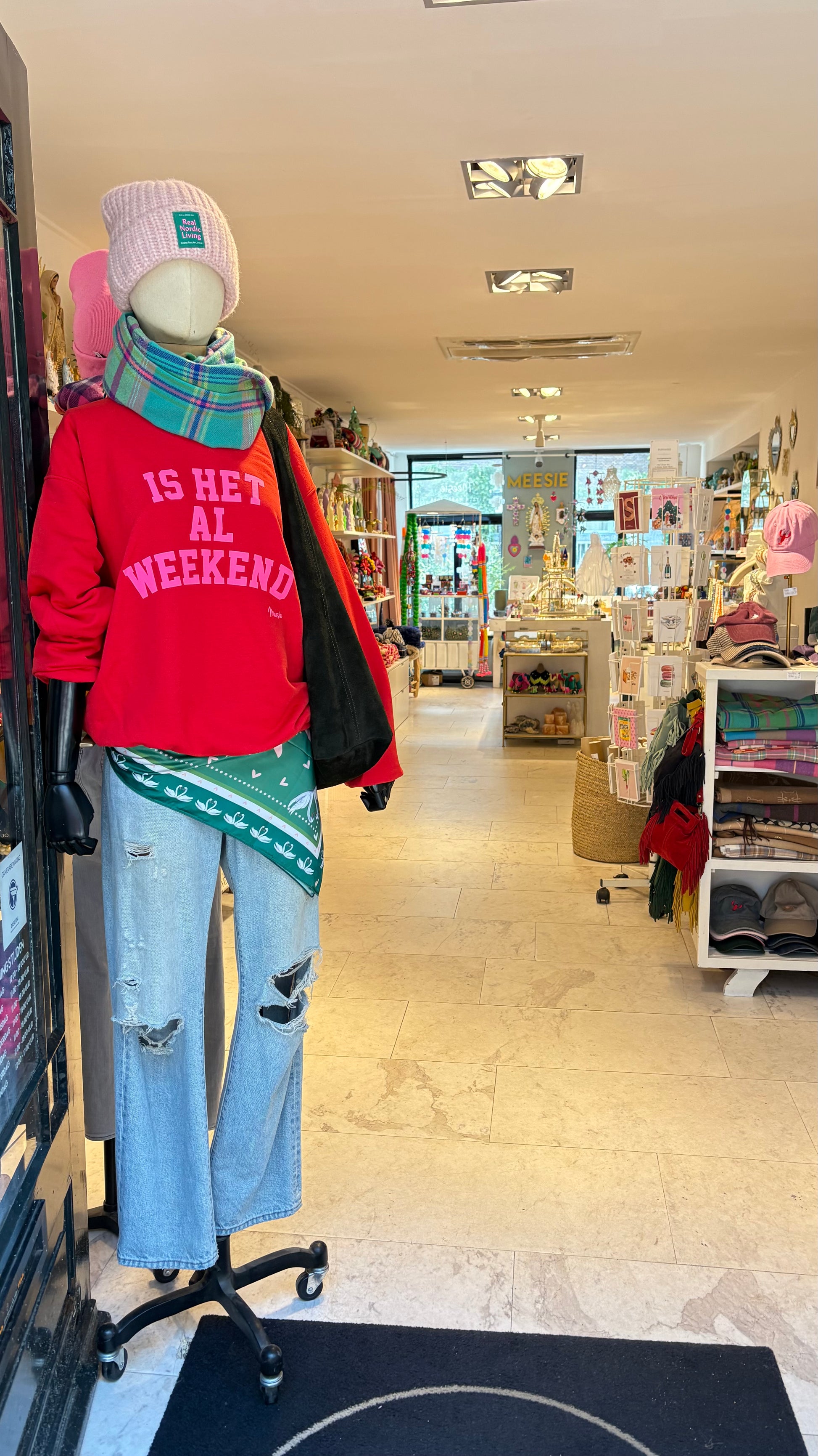 NIEUW Trui: “Is het al weekend” Rood met neon Roze