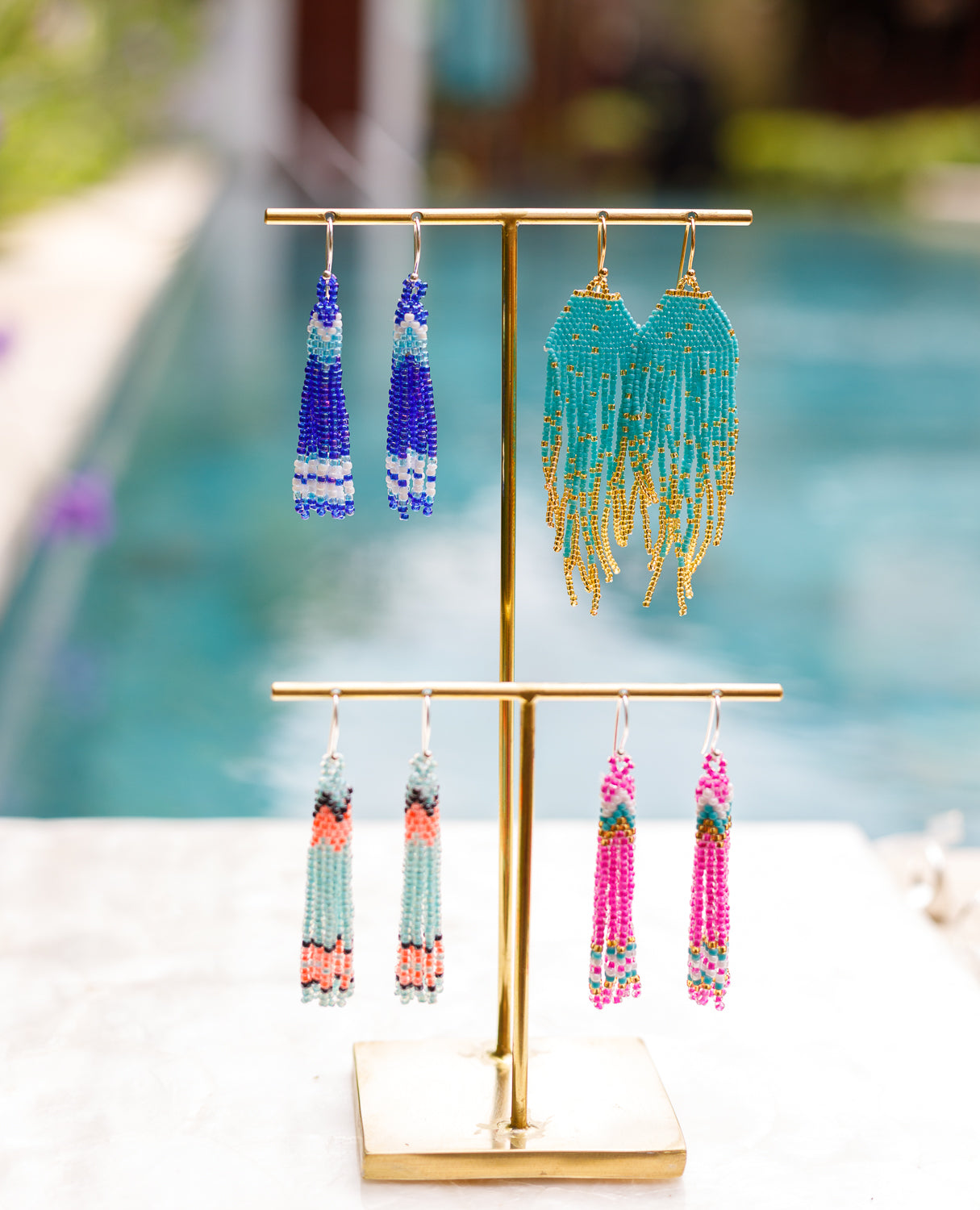Oeh lalala.. deze oorbellen staan heerlijk vrolijk in je lellen! Daarnaast maken deze beauties je niet alleen blij als je ze draagt, maar zijn ze ook een creatieve en Fairtrade samenwerking tussen de getalenteerde kralen kunstenares Lupe in Mexico en door onze getalenteerde zilversmid Made op Java Indonesië, hoe cool! De hangers hebben een knap kralen patroon in roze, wit en een snufje groene kleur en zijn allen uniek omdat Lupe ze met de hand rijgt.