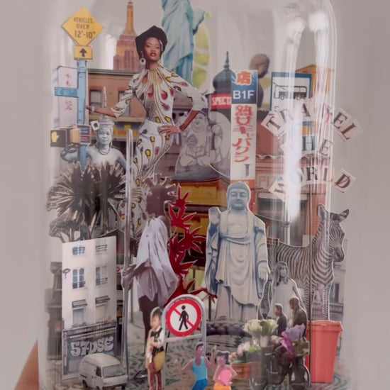 De glazen stolpjes hebben een diorama miniatuur wereld van papier gemaakt. Deze kleine stolp met daarin verschillende herkenningspunten uit de wereld is echt te gek voor alle mensen die warme herinneringen koesteren aan de reizen die zij gemaakt hebben of zouden willen maken.