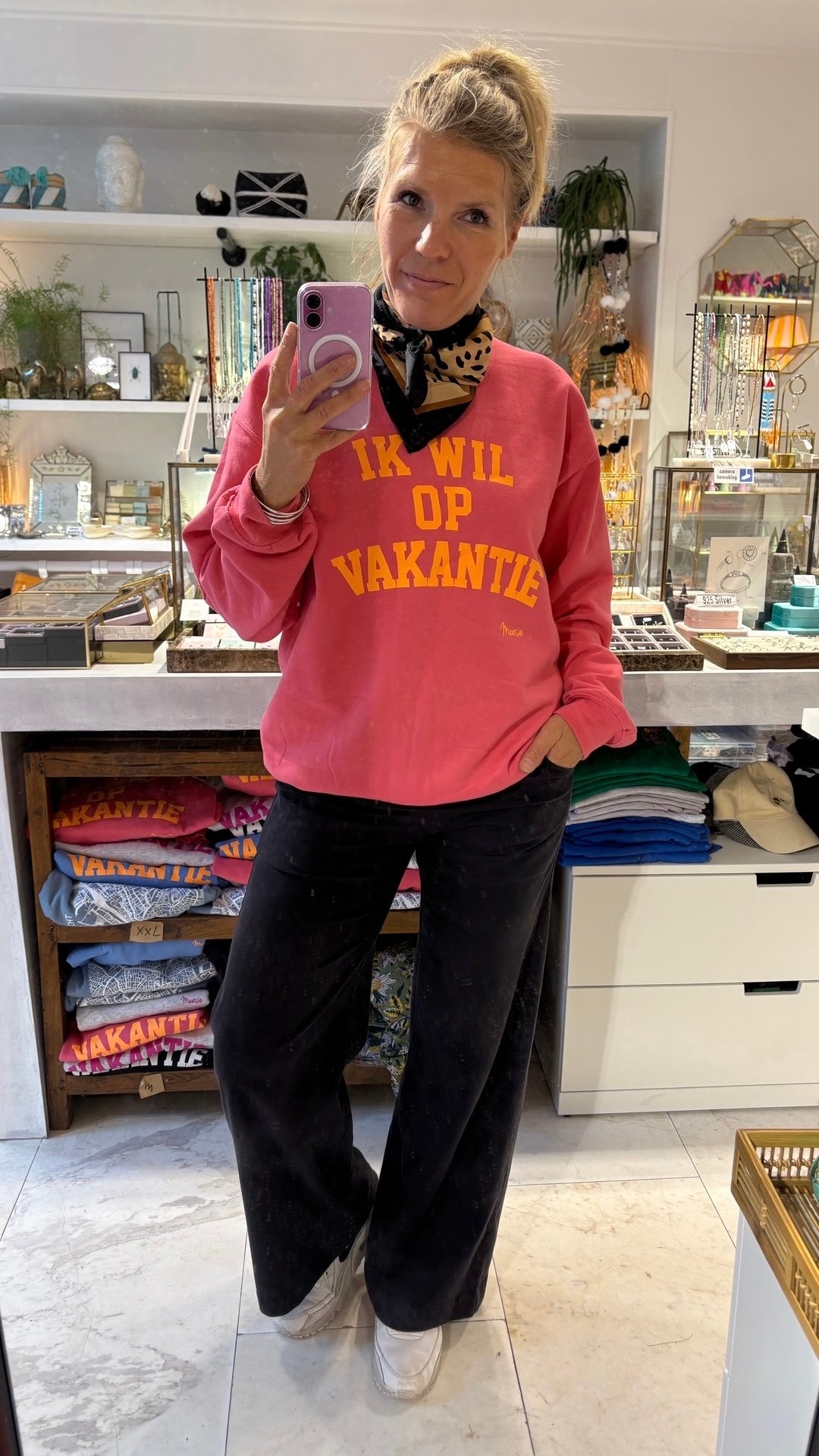 Trui: “Ik wil op Vakantie” Roze met neon oranje